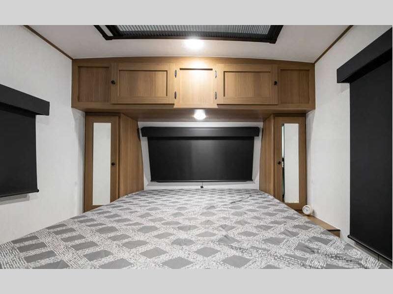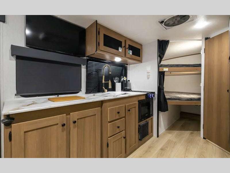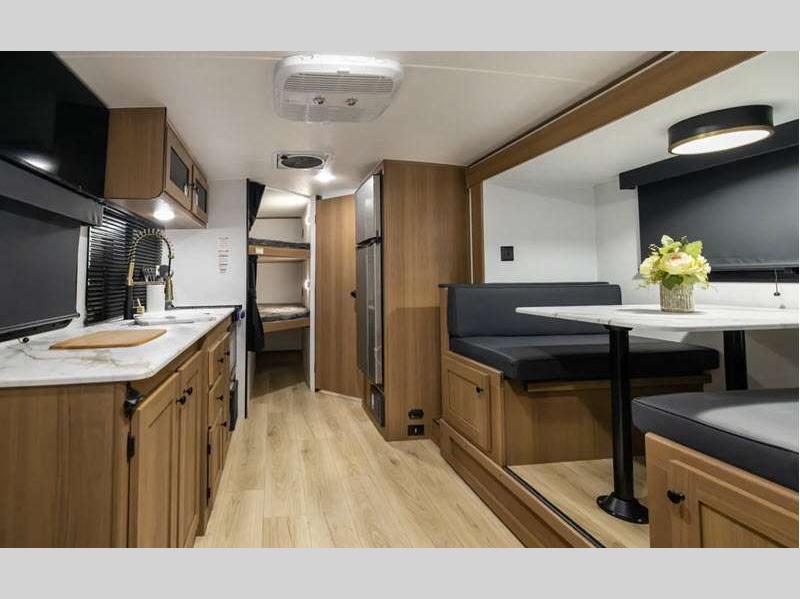 Sleeps 5 Slides 1 Length 22 ft 7 in Ext Width 7 ft 6 in Ext Height 10 ft 2 in Hitch Weight 554 lbs GVWR 4700 lbs Dry Weight 3936 lbs Cargo Capacity 764 lbs Fresh Water Capacity 52 gals Grey Water Capacity 27 gals Black Water Capacity 27 gals Number Of Bunks 2 Available Beds Queen Refrigerator Type 12V Refrigerator Size 10 cu ft Cooktop Burners 2 Number of Awnings 1 LP Tank Capacity 20 lbs Water Heater Type On Demand Tankless AC BTU 15000 btu Awning Info 14' Power w/LED Lights Axle Count 1 Number of LP Tanks 2 Shower Type Tub/Shower Combo Electrical Service 55 amp Solar Wattage 400 watts Similar Floorplans