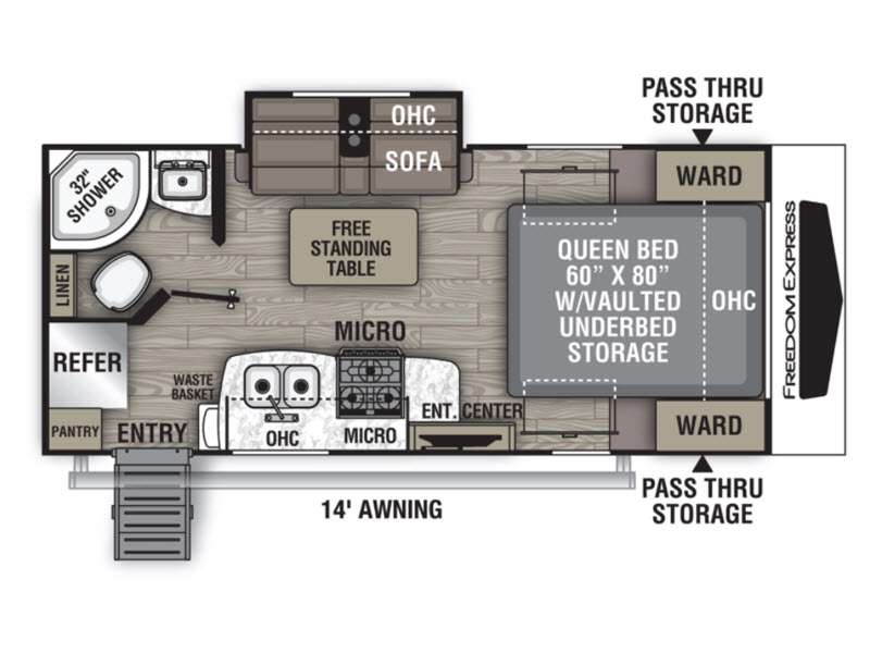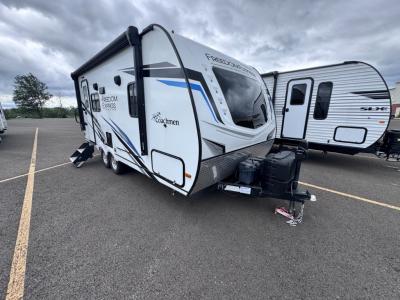 With any Freedom Express Ultra Lite travel trailer by Coachmen you will appreciate quality construction materials, such as vacuum bonded walls with Azdel composite, a 3/4 gel coated fiberglass cap with an automotive glass windshield, and a heated enclosed underbelly. Each model also features Tufflex PVC roofing, front rock guard, and E-Z Lube axles for smooth towing. Inside, you'll find kitchen backsplash, hidden hinge cabinetry, and wear-resistant vinyl flooring throughout. The power tongue jack included with the Ultra Lite Express Package will make set-up a breeze, and each model includes back-up camera prep and they are Freedom solar ready if you plan to go off-grid. Enjoy lightweight camping with a Freedom Express Ultra Lite travel trailer today!