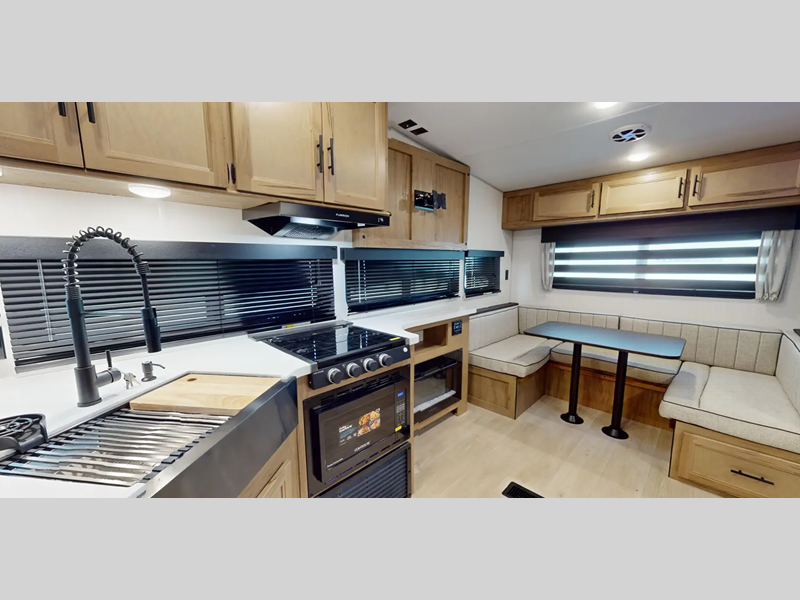 Each Black Label trailer is built with fiberglass gel coat sided walls, frameless windows, and thermofoil insulation for added protection. Inside you will enjoy features such as upgraded solid surface countertops, upgraded reading lights, and designer cushion fabric!