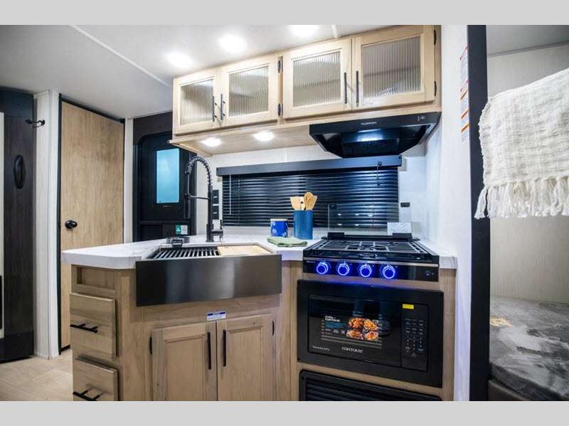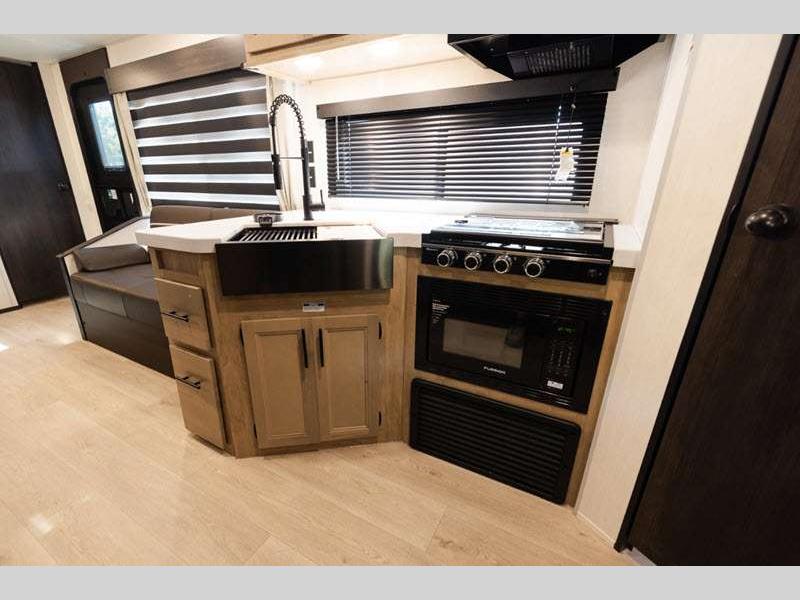 Sleeps 5 Slides 1 Length 28 ft 10 in Ext Width 8 ft Ext Height 10 ft 8 in Int Height 0 ft Hitch Weight 801 lbs GVWR 7801 lbs Dry Weight 5750 lbs Cargo Capacity 2051 lbs Fresh Water Capacity 52 gals Grey Water Capacity 38 gals Black Water Capacity 38 gals Furnace BTU 20000 btu Available Beds RV King Refrigerator Type 12V Cooktop Burners 3 Number of Awnings 1 Water Heater Type Tankless AC BTU 15000 btu Cargo Deck Size 0 ft Awning Info 15' Full Length Power w/LED Light Strip Axle Count 2 Shower Type Neo-Angled Solar Wattage 200 watts Similar Floorplans