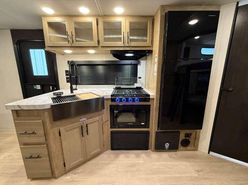 Sleeps 4 Slides 1 Length 30 ft 11 in Ext Width 8 ft Ext Height 10 ft 6 in Int Height 0 ft Hitch Weight 764 lbs GVWR 7764 lbs Dry Weight 5987 lbs Cargo Capacity 1777 lbs Fresh Water Capacity 52 gals Grey Water Capacity 38 gals Black Water Capacity 38 gals Furnace BTU 20000 btu Available Beds RV King Refrigerator Type 12V Cooktop Burners 3 Number of Awnings 1 Water Heater Type Tankless AC BTU 15000 btu Cargo Deck Size 0 ft Awning Info 15' Full Length Power w/LED Light Strip Axle Count 2 Shower Type Tub/Shower Combo Solar Wattage 200 watts Similar Floorplans
