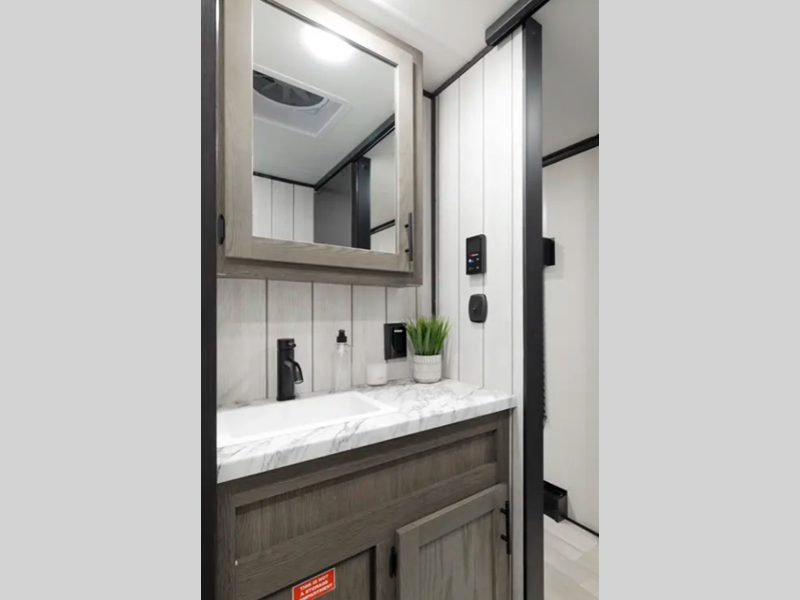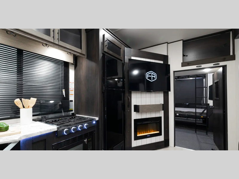 You will love the real wood cabinet doors and drawers inside, along with LED lights and a black stainless steel farm sink that will have you feeling more at home. There are power stabilizer jacks to make your RV more secure, and the power awning with LED accent lighting will create an outdoor space campground neighbors will want to check out.