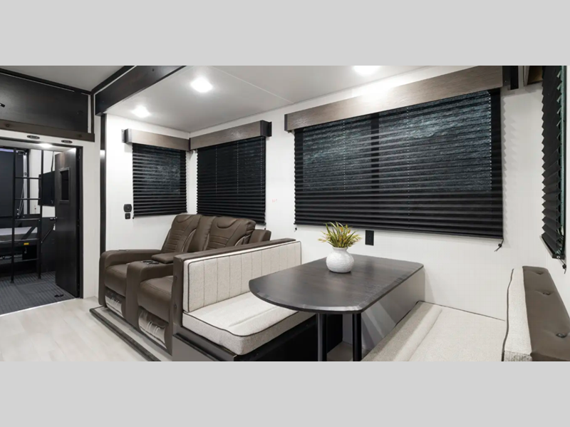Sleeps 6 Slides 2 Length 39 ft 5 in Ext Width 8 ft 6 in Ext Height 13 ft 5 in Hitch Weight 2470 lbs GVWR 14470 lbs Dry Weight 11173 lbs Cargo Capacity 3297 lbs Fresh Water Capacity 96 gals Grey Water Capacity 44 gals Black Water Capacity 44 gals Furnace BTU 35000 btu Available Beds RV King Refrigerator Type 12V Refrigerator Size 10 cu ft Cooktop Burners 3 Number of Awnings 2 Garage Size 13 ft Water Heater Type On Demand Tankless AC BTU 15000 btu TV Info LR TV Awning Info 12' and 15' Power w/LED Accent Lighting Axle Count 2 Washer/Dryer Available Yes Shower Type Standard Electrical Service 50 amp Similar Floorplans
