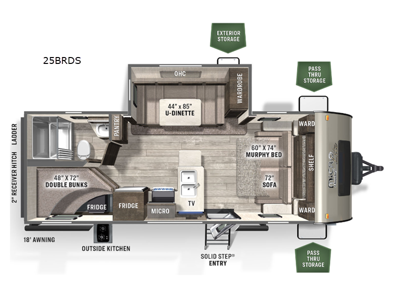 Sleeps 8 Slides 1 Length 25 ft 11 in Ext Width 8 ft Ext Height 10 ft 11 in Hitch Weight 773 lbs Dry Weight 5499 lbs Cargo Capacity 1434 lbs Fresh Water Capacity 54 gals Grey Water Capacity 30 gals Black Water Capacity 30 gals Furnace BTU 35000 btu Number Of Bunks 2 Available Beds Murphy Refrigerator Type 12V Cooktop Burners 3 Number of Awnings 1 LP Tank Capacity 30 lbs Water Heater Capacity 6 gal Water Heater Type Gas/Electric with Quick Recovery AC BTU 15000 btu TV Info LR 12V Smart Entertainment TV Awning Info 18' Power with Adjustable Rain Dump and LED Lights Axle Count 2 Number of LP Tanks 2 Shower Type Standard Similar Travel Trailer Floorplans