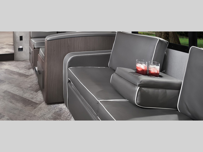 Each model features rotocast storage compartments, sleek frameless windows, and backup camera/side view cameras with a 3-way monitor for a hassle-free driving experience. You will love the swivel captain's seats, the full baths with a privacy door, no wet baths, and black out roller shades! This coach also includes a Trumi Combi electric heat and high efficiency water heater, a 2.8 kW gas generator, and a 10" touch screen CarPlay/Android radio with USB and Bluetooth!