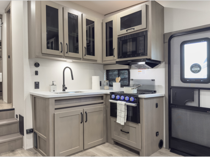Sleeps 3 Slides 1 Length 30 ft Ext Width 8 ft Ext Height 12 ft Hitch Weight 950 lbs GVWR 9995 lbs Dry Weight 7664 lbs Fresh Water Capacity 55 gals Grey Water Capacity 78 gals Black Water Capacity 39 gals Tire Size ST225/75R15 LRE Furnace BTU 30000 btu Available Beds Queen Refrigerator Type 12V Refrigerator Size 10 cu ft Cooktop Burners 3 Shower Size 30" x 36" Number of Awnings 1 LP Tank Capacity 30 lbs Water Heater Type On Demand Tankless TV Info LR 40" High-Definition LED TV Awning Info 19' One Touch Electric LED Axle Count 2 Number of LP Tanks 2 Shower Type Walk-In Shower Electrical Service 50 amp Similar Floorplans