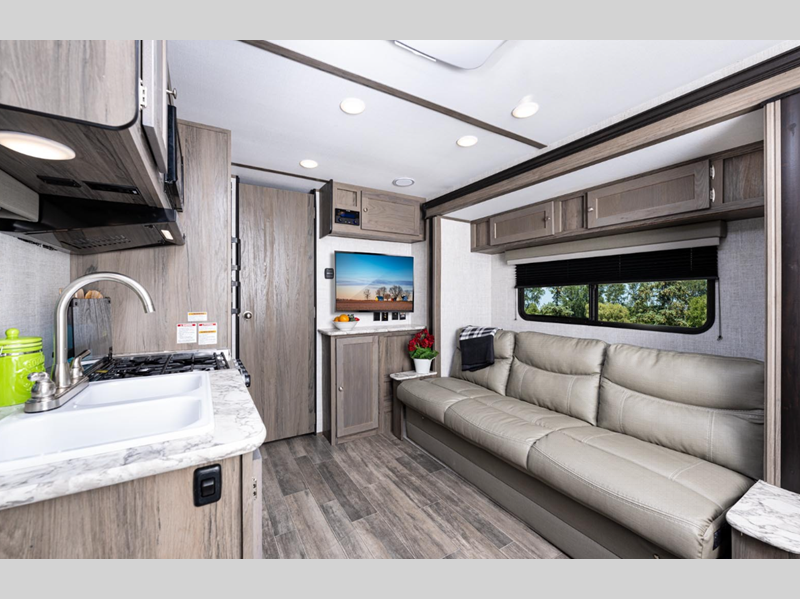 Sleeps 3 Slides 1 Length 22 ft 6 in Ext Width 7 ft 6 in Ext Height 10 ft 6 in Int Height 6 ft 8 in Hitch Weight 460 lbs Dry Weight 3655 lbs Cargo Capacity 2405 lbs Fresh Water Capacity 57 gals Grey Water Capacity 33 gals Black Water Capacity 33 gals Tire Size 14" Available Beds Two Twin with King Conversion Refrigerator Type 12V Refrigerator Size 8 cu ft Shower Size 30" x 36" Number of Awnings 1 LP Tank Capacity 20 lbs Water Heater Type Tankless AC BTU 15000 btu Awning Info Electric with LED Lights Axle Count 2 Number of LP Tanks 2 Shower Type Standard Electrical Service 30 amp Similar Floorplans