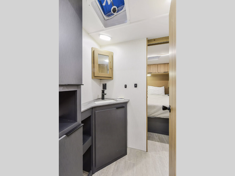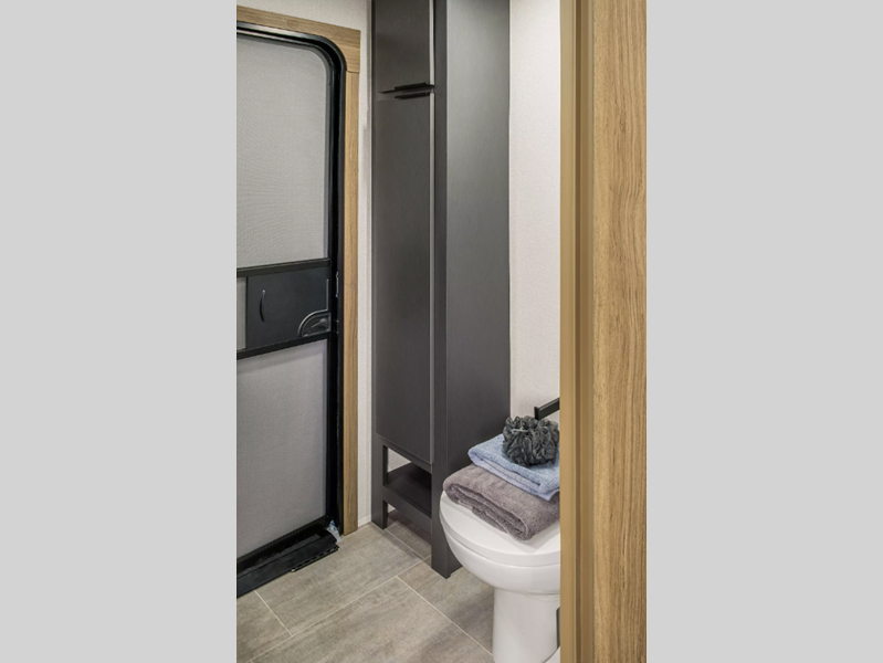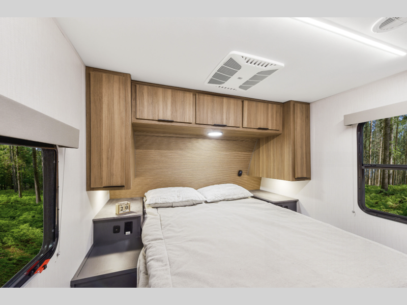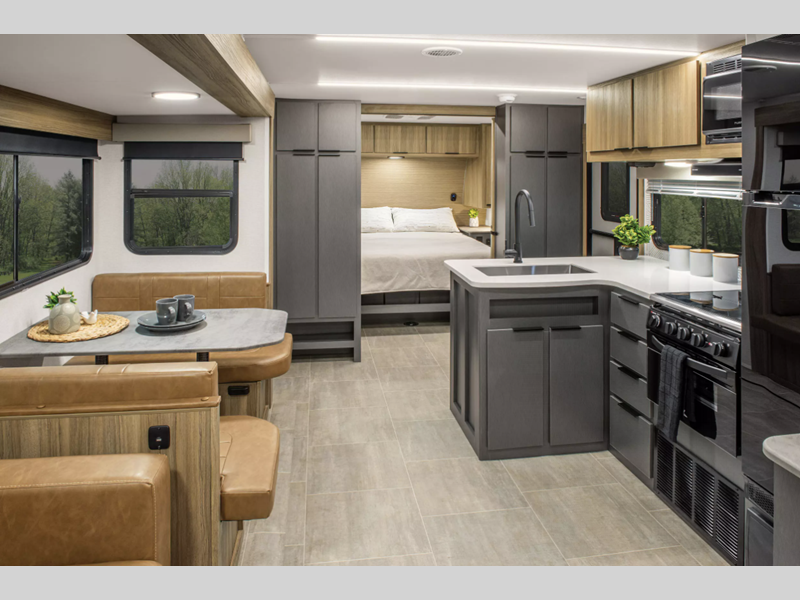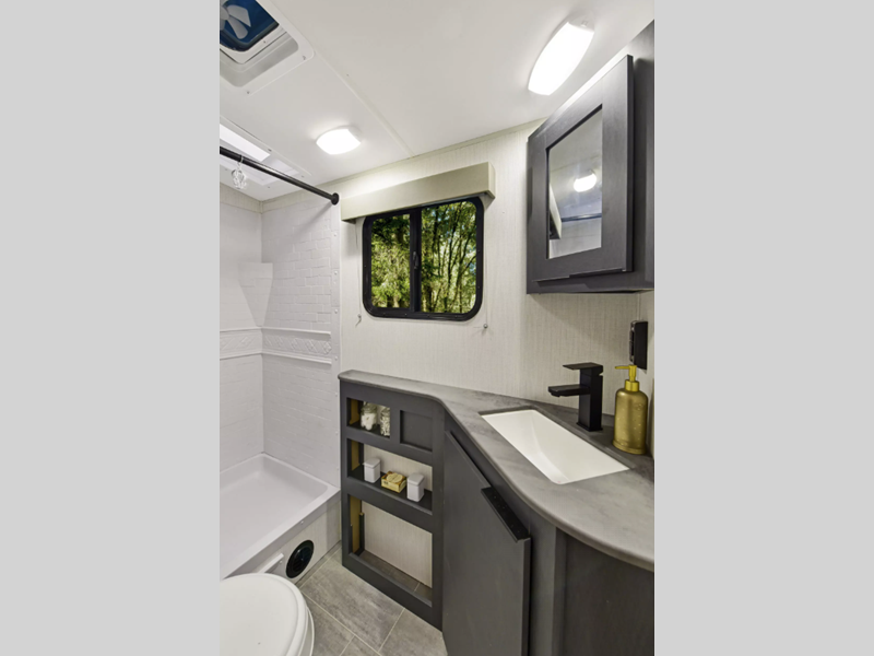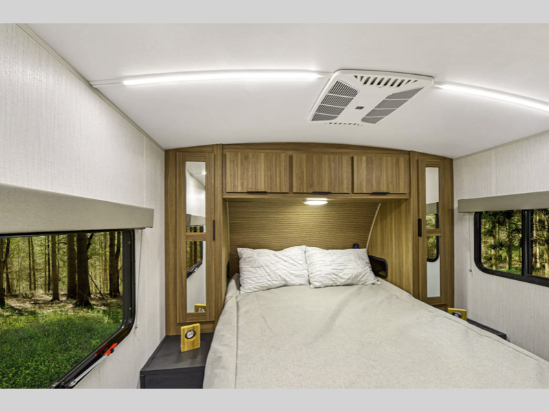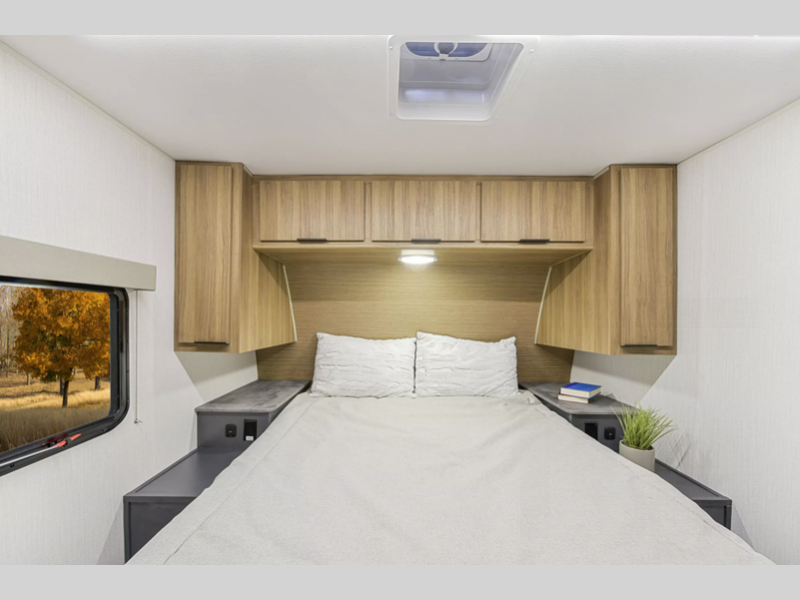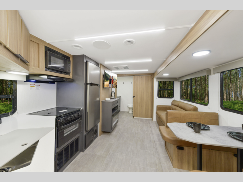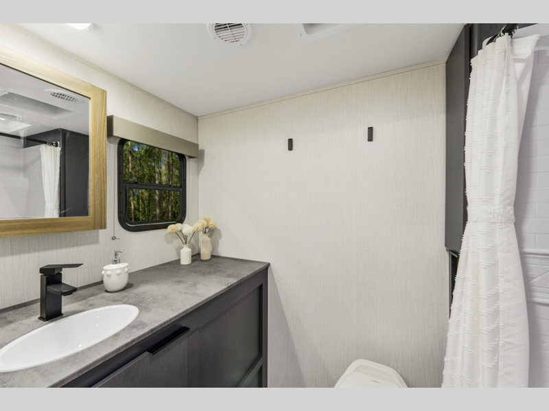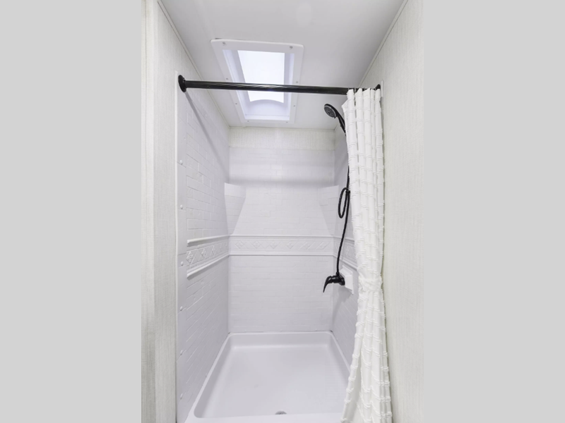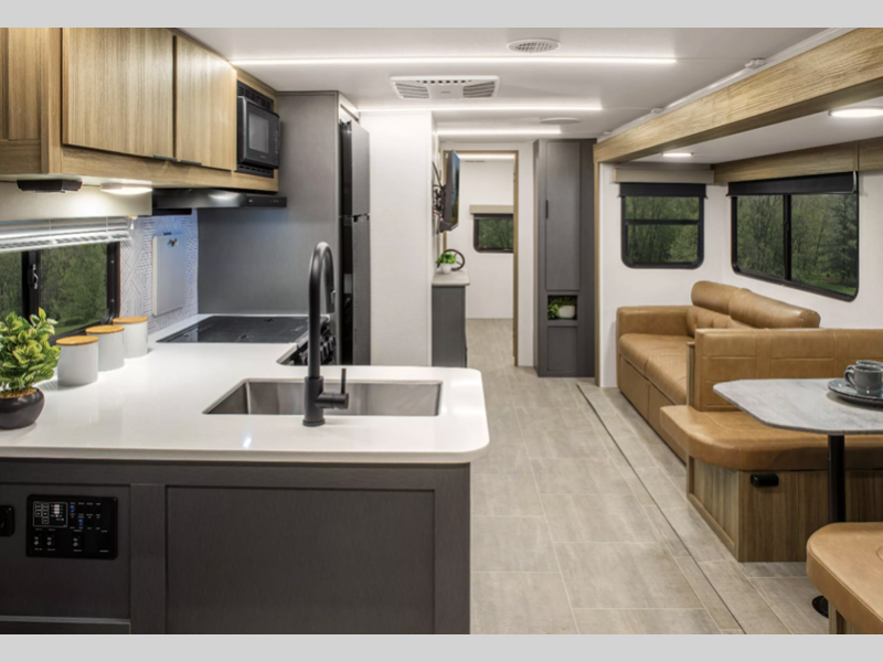 The aerodynamic front cap with an oversized panoramic windshield offers a clear view of your beautiful surrounding, and the Azdel onboard composite sidewalls provide a lighter, sustainable and quieter interior. With a power auto-leveling system with hitch memory, you can set up and tear down with ease, and you will feel right at home with the residential appliance package.