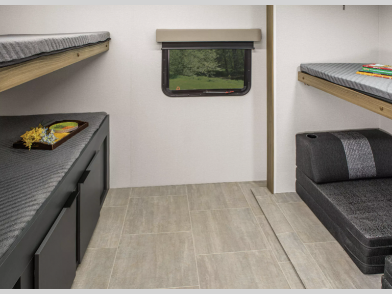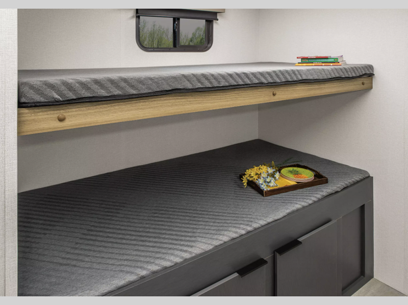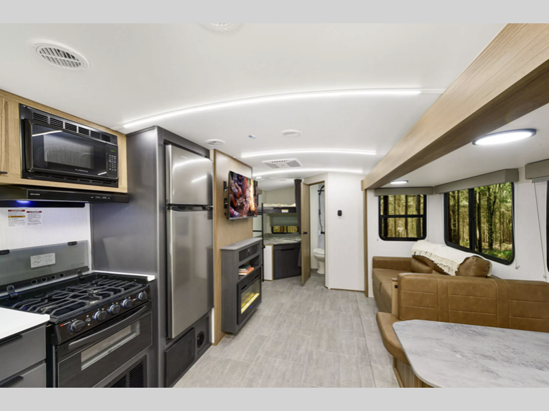 Sleeps 6 Slides 1 Length 31 ft 11 in Ext Width 8 ft 1 in Ext Height 11 ft 6 in Interior Color Uptown Hitch Weight 940 lbs GVWR 9740 lbs Dry Weight 6418 lbs Cargo Capacity 3290 lbs Fresh Water Capacity 46 gals Grey Water Capacity 60 gals Black Water Capacity 30 gals Furnace BTU 30000 btu Number Of Bunks 2 Available Beds Queen Refrigerator Type Residential Stainless Steel Refrigerator Size 10.7 cu ft Cooktop Burners 3 Number of Awnings 1 Axle Weight 3500 lbs LP Tank Capacity 20 lbs Water Heater Capacity 6 gal Water Heater Type DSI Gas/Electric AC BTU 13500 btu TV Info LR 40" LED TV Awning Info 20' Power w/ LED Light Strip Axle Count 2 Number of LP Tanks 2 Shower Type Standard Electrical Service 30 amp Similar Floorplans