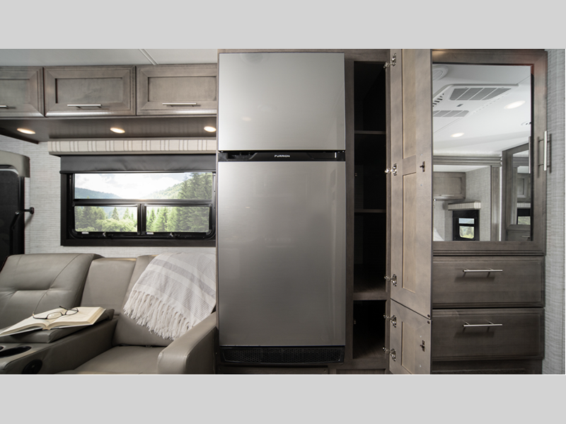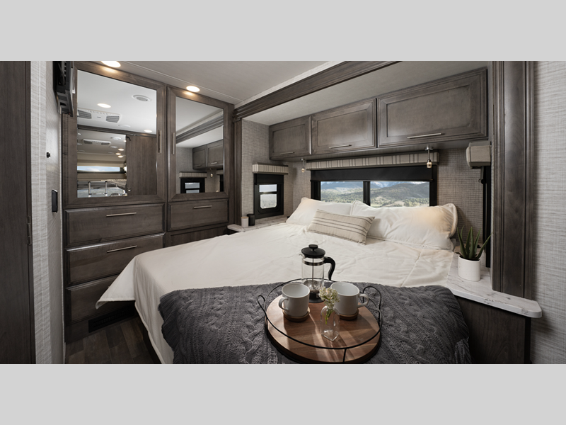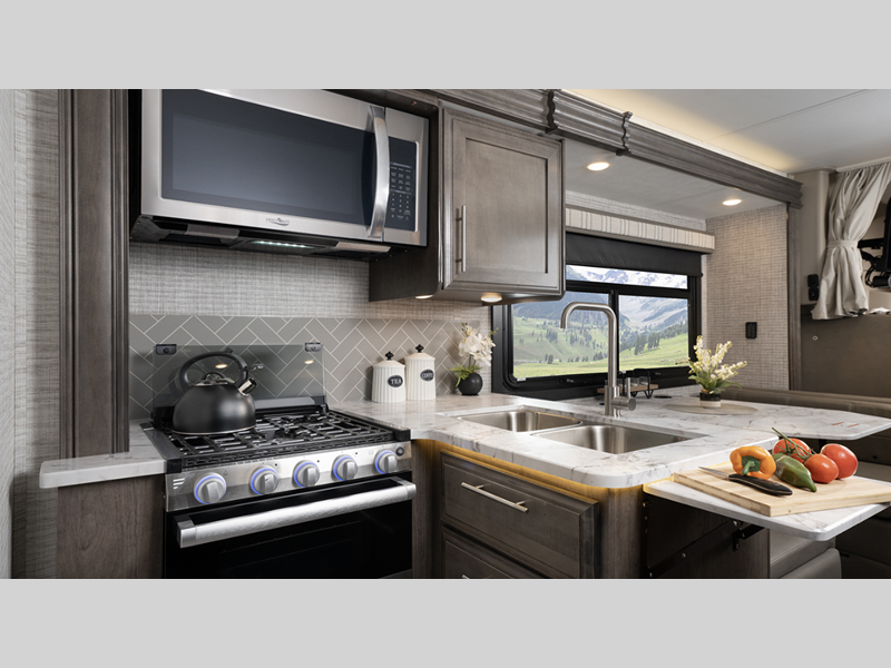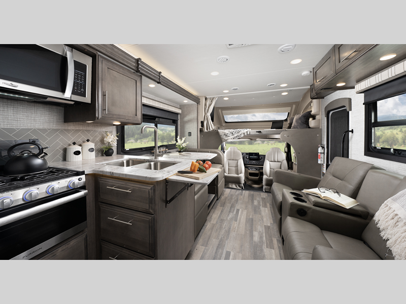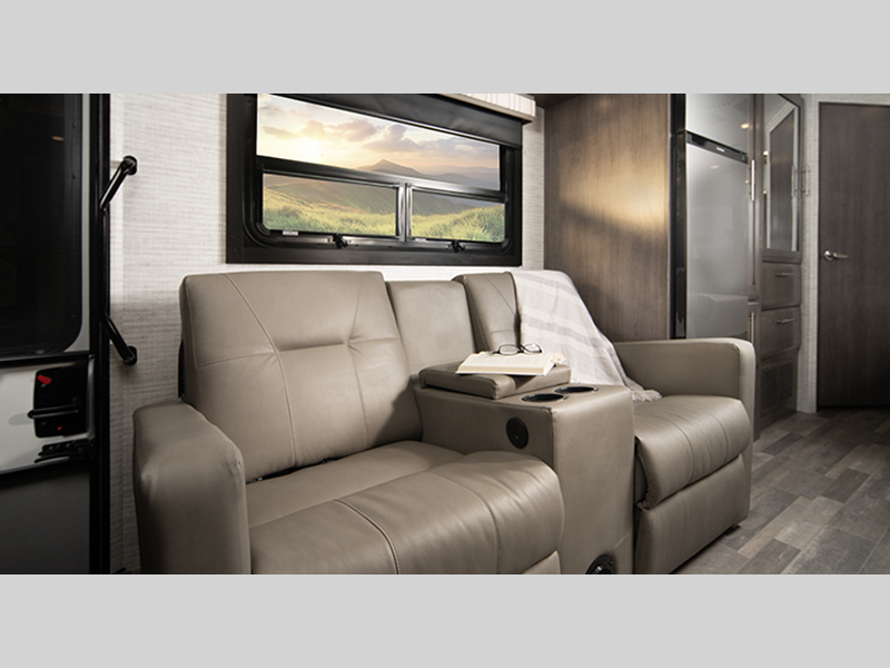 Each model includes a new Winegard 2.0 Wi-Fi/4G antenna and an LED HD Smart TV in the living room to wash away those rainy day blues. The full-body paint options are sure to turn heads, and you'll love the panoramic window with a shade in the front cap. The interior will have you feeling right at home with LED-lit hardwood fascia, hardwood cabinet doors, frameless windows, and decorative kitchen backsplash.