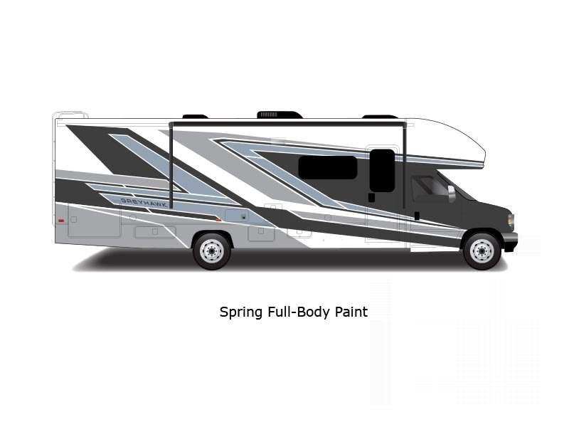 Sleeps 6 Slides 2 Length 29 ft 11 in Ext Width 8 ft 4 in Ext Height 11 ft 8 in Int Height 7 ft Interior Color Modern Farmhouse, Oakridge Exterior Color Standard Graphics, Full-Body Paint: Spring, Summer, Fall, Winter, Midnight Hitch Weight 7500 lbs GVWR 14500 lbs Fresh Water Capacity 42 gals Grey Water Capacity 41 gals Black Water Capacity 31 gals Tire Size LT225/75R16E Furnace BTU 30000 btu Generator 4000 Watt Fuel Type Gas Engine 7.3L V8 Chassis Ford E-450 Horsepower 325 hp Fuel Capacity 55 gals Wheelbase 195 in Number Of Bunks 1 Available Beds RV King Torque 450 ft-lb Refrigerator Type 12V Refrigerator Size 10 cu ft Cooktop Burners 3 Shower Size 30" x 36" Number of Awnings 1 LP Tank Capacity 16.5 gals Water Heater Capacity 6 gal Water Heater Type Gas/Electric DSI AC BTU 15000 btu Basement Storage 37 cu. ft. TV Info LR LED HD Smart TV Awning Info 18' Electric with LED Lights Gross Combined Weight 22000 lbs Shower Type Standard Electrical Service 30 amp Similar Floorplans