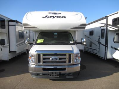With any Greyhawk Class C gas motorhome by Jayco you will experience smooth sailing thanks to the JRIDE PLUS that comes with Koni shock absorbers, a computer-balanced driveshaft, Hellwig helper springs, and more. The Ford E-450 chassis with a 7.3L V8 325 HP engine will power your excursions, and you'll appreciate the added safety features for your peace of mind. Each model features a Sony infotainment center with Apple CarPlay and Android Auto, backup and side-view cameras, and a tire pressure monitor system the driver is sure to appreciate. Durable construction begins with Stronghold VBL roof, floor and sidewalls, bead-foam insulation, and a one-piece seamless fiberglass front cap. Head inside to find blackout night roller shades, LED-lit pressed countertops, an 84" interior ceiling height, and hardwood cabinet doors and drawers.