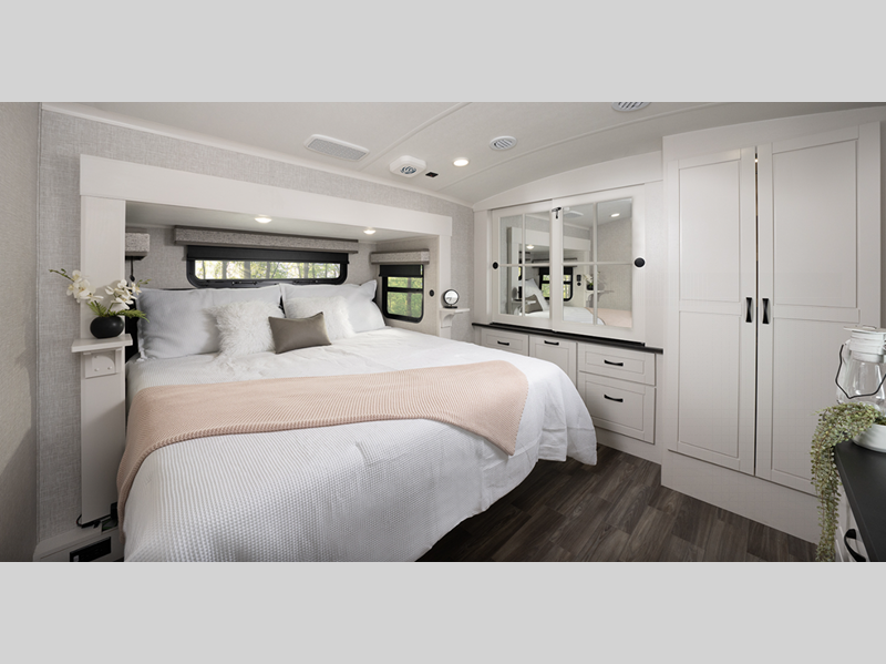 Sleeps 4 Slides 3 Length 36 ft Ext Width 8 ft 6 in Ext Height 13 ft 4 in Int Height 8 ft 6 in Interior Color Modern Farmhouse Exterior Color Mineral, Pearl, Smoke Hitch Weight 2570 lbs GVWR 16000 lbs Dry Weight 12875 lbs Cargo Capacity 3125 lbs Fresh Water Capacity 75 gals Grey Water Capacity 87 gals Black Water Capacity 50 gals Tire Size 215/75R17.5"H Furnace BTU 40000 btu Available Beds King Refrigerator Type GE Residential Refrigerator Size 21 cu ft Cooktop Burners 4 Number of Awnings 2 LP Tank Capacity 40 lbs. Water Heater Capacity 16 gal Water Heater Type Gas/Electric DSI AC BTU 30000 btu TV Info LR 50" 4K Smart LED HDTV, BR 32" 4K Smart TV Awning Info 10' and 16' Electric w/Integrated LED Lights Axle Count 2 Washer/Dryer Available Yes Number of LP Tanks 3 Shower Type Walk-In Shower Similar Floorplans