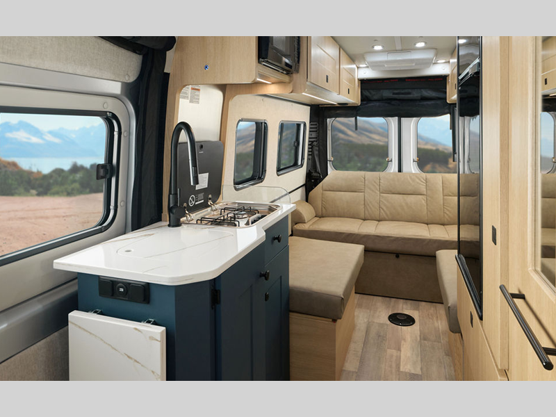 Sleeps 2 Length 20 ft 9 in Ext Width 6 ft 11 in Ext Height 9 ft 5 in Int Height 6 ft 2 in Hitch Weight 2150 lbs GVWR 9350 lbs Cargo Capacity 1700 lbs Fresh Water Capacity 31 gals Grey Water Capacity 14 gals Black Water Capacity 4 gals Tire Size LT225/75R16E Black Wall Furnace BTU 14300 btu Generator Underhood Fuel Type Gasoline Engine 3.6L V6 24 Valve Chassis Ram ProMaster 3500 Extended Van Horsepower 280 hp Fuel Capacity 24 gals Wheelbase 159 in Available Beds Two Twin, King Conversion Refrigerator Type 12V Refrigerator Size 3.1 cu ft Cooktop Burners 2 Number of Awnings 1 LP Tank Capacity 5.9 gals Water Heater Type On Demand AC BTU 13500 btu TV Info Coach 24" Smart TV Awning Info 13' Power Gross Combined Weight 11500 lbs Shower Type Wet/Bath Shower Electrical Service 30 amp Solar Wattage 300 watts -