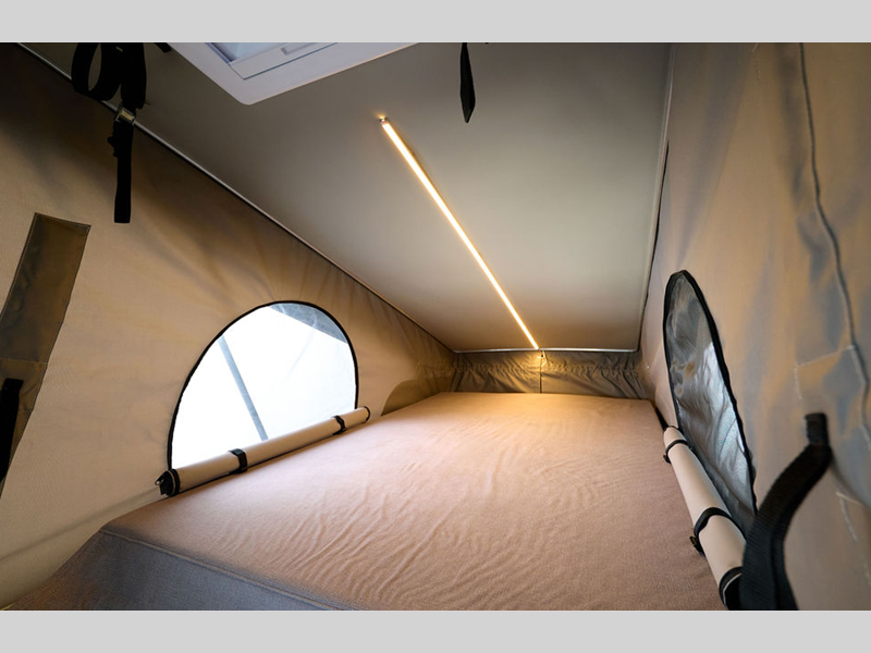 - Pop top sleeping area offers a large bed and storage tray with charging ports