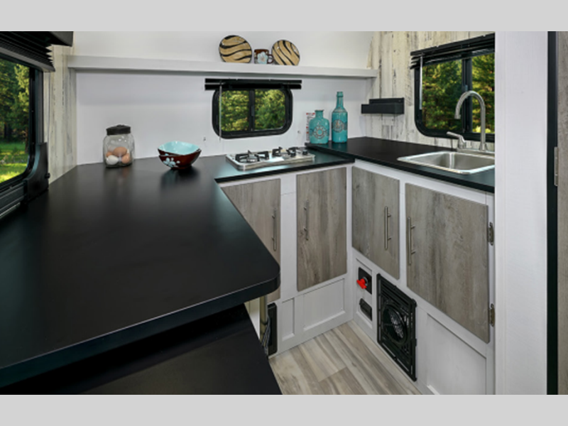 There are 13" custom lite-weight aluminum wheels and an aluminum chassis for added durability. You'll also appreciate the rear stabilizer jacks for more stability, and the outside shower to wash off hiking gear. A versatile sofa bed provides both seating and sleeping space, and you can prepare your best meals on the two burner stovetop.
