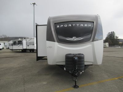 An elegant design and new features come with every one of these Venture RV SportTrek Touring Edition travel trailers! The NXG Huck bolt frame holds these units together and a walkable roof covers them. Heads will turn down the highway and at the campsite with an upgraded graphics package and a painted fiberglass front cap with integrated LED light. The exterior pass-through storage area has slam latch baggage doors with magnetic catches so you don't have to worry about them closing on you and a motion activated light to see your items clearly even at night. Luxury abounds throughout these units, especially with the mandatory Interior Luxury package which comes with solid surface kitchen countertops, designer valances with fabric nightshades, two 30" frameless fireplaces, and Beauflor wood plank flooring that is easy to clean. Come find your favorite model today!