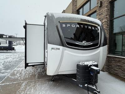 An elegant design and new features come with every one of these Venture RV SportTrek Touring Edition travel trailers! The NXG Huck bolt frame holds these units together and a walkable roof covers them. Heads will turn down the highway and at the campsite with an upgraded graphics package and a painted fiberglass front cap with integrated LED light. The exterior pass-through storage area has slam latch baggage doors with magnetic catches so you don't have to worry about them closing on you and a motion activated light to see your items clearly even at night. Luxury abounds throughout these units, especially with the mandatory Interior Luxury package which comes with solid surface kitchen countertops, designer valances with fabric nightshades, two 30" frameless fireplaces, and Beauflor wood plank flooring that is easy to clean. Come find your favorite model today!